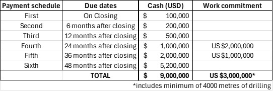 The Option Agreement will be in a form generally common for mineral property purchase options in Chile, including comprehensive representations and warranties by the Vendors as to the status of the Concessions, the corporate status and power of each of the parties, comprehensive covenants and other protections for the benefit of the parties.