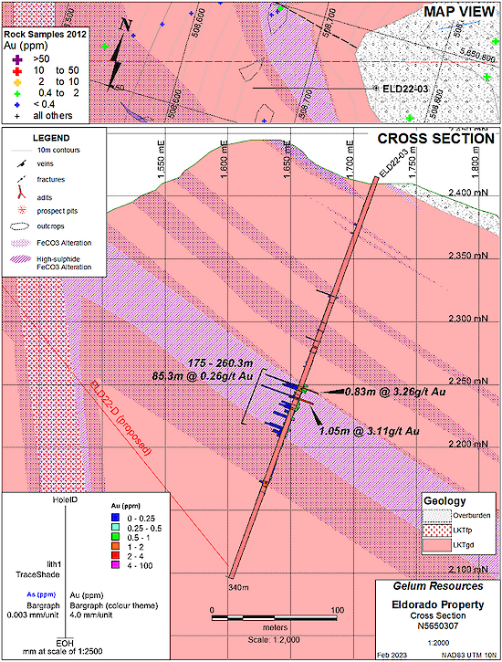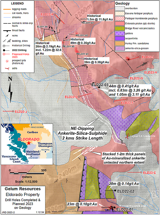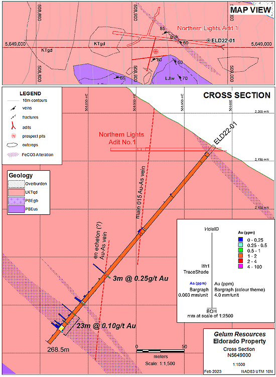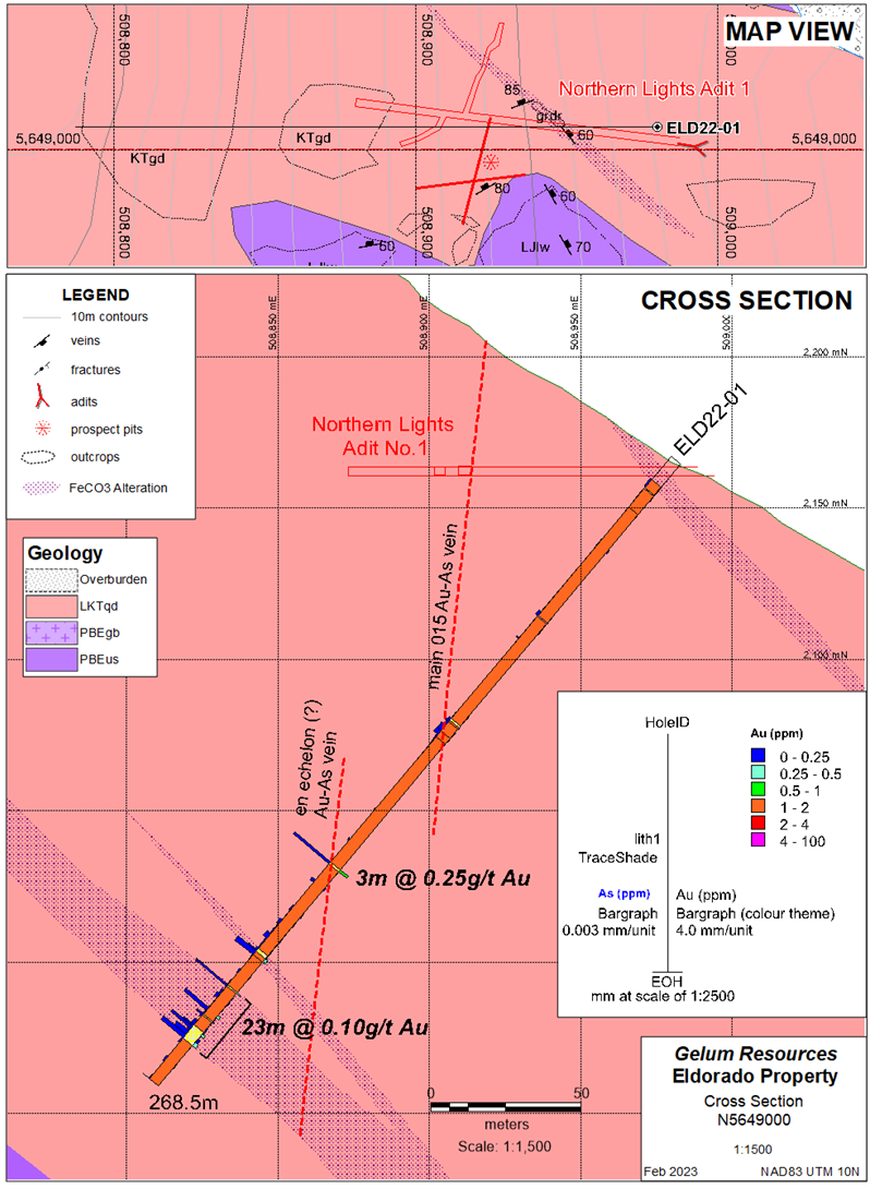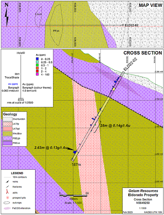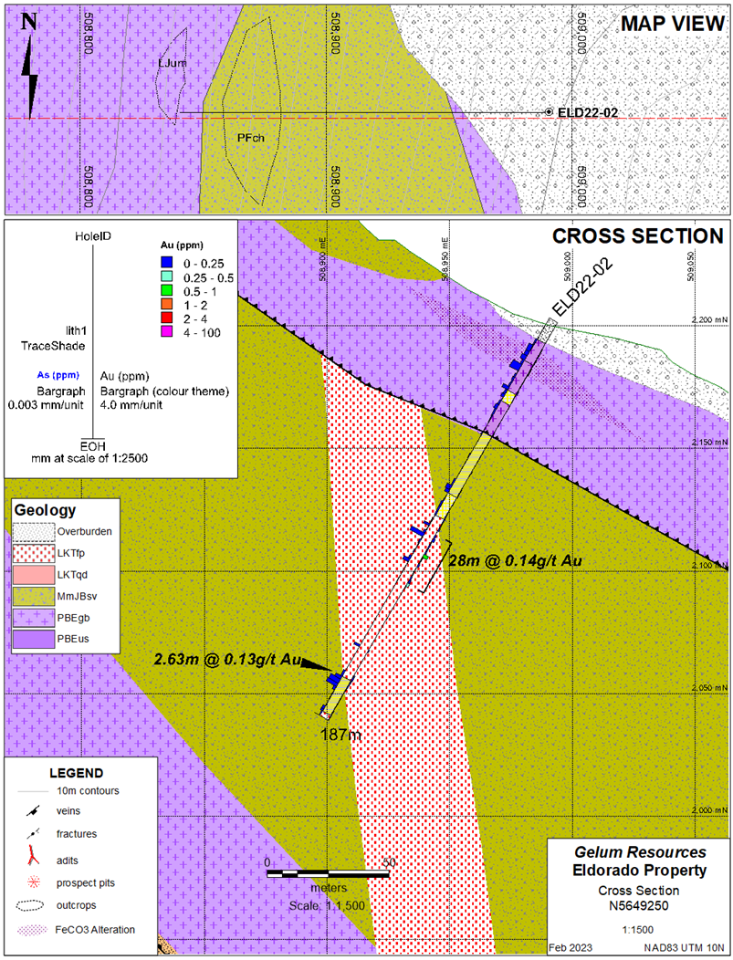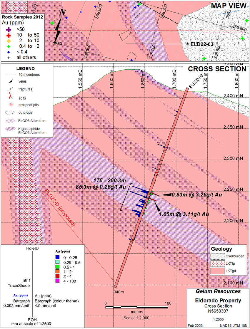 FOR IMMEDIATE RELEASE…Vancouver, BC – March 6, 2023 – Gelum Resources Ltd. (the "Company" or "Gelum", CSE: GMR, OTCQB: GMRCF) has received assay results for three diamond drill holes (795.5 metres) completed in late 2022 at the Eldorado Gold Project. These holes are the start of a planned 11-hole, 3000 metre, helicopter-supported, diamond-drill programme that will be completed this year (Figures 1 and 8). Drilling intersected gold in all holes, associated with intense alteration (silica and iron-carbonate), and favourable hydrothermal vein textures (quartz-cemented breccias, crack and seal veins, open space filling) and sulphides including fine-grained pyrite and arsenopyrite. These features are associated with high-grade gold-bearing structures 20 km south in the district (Figure 8). The best intersection includes 44 metres assayed 0.414 g/t Au (ELD22-03), which contains two close-spaced, higher-grade intervals of 3.26 g/t Au over 0.83m and 3.11 g/t Au over 1.05m.