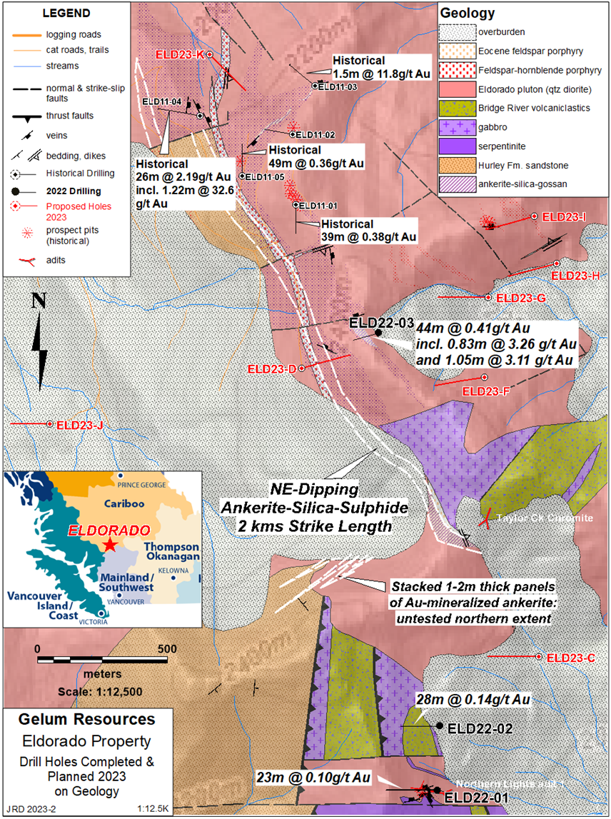 Figure 1: Eldorado drilling completed in 2022, planned for 2023, and historical on geology with highlighted results. The inferred surface trace of the thickest ankerite panel intersected in hole ELD22-3 is shown, but other panels occur above and below this.