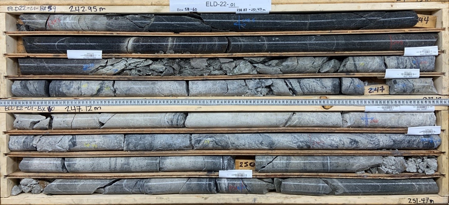 Figure 2: ELD22-01 core from 243m to 252m, showing quartz-ankerite-sulphide mineralization that from 246 to 251m returned 5m of 0.234 g/t Au.