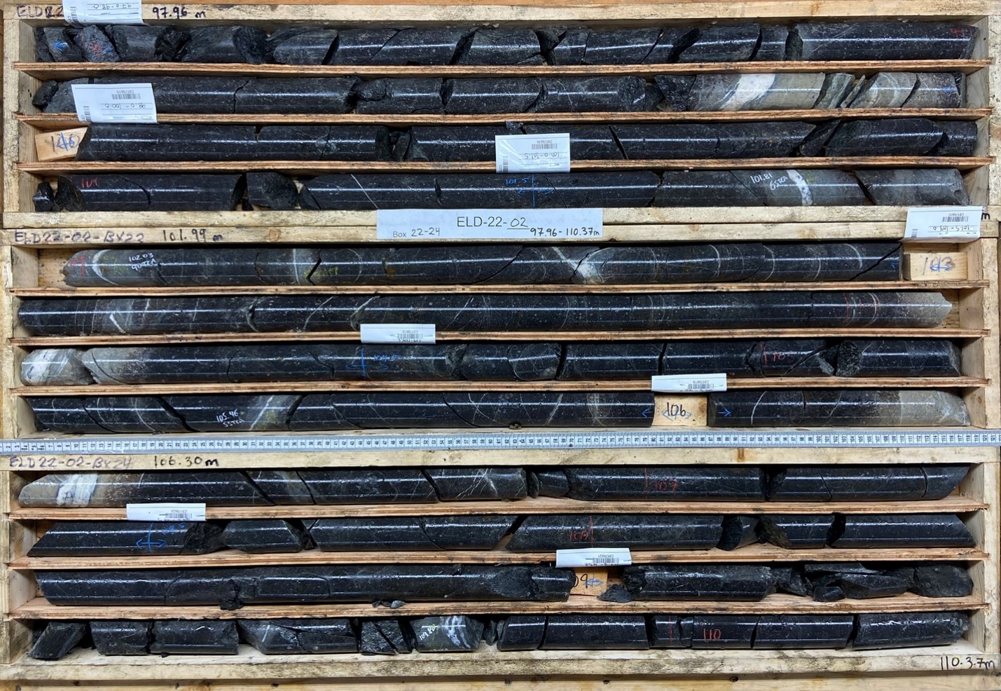 Figure 4: ELD22-02 core from 98m to 110.4m, with several narrow quartz-sulphide breccias and veins. The interval from 109 – 110.5m returned 0.511g/t Au.