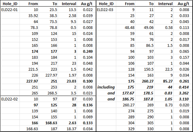 This thick interval of ankerite-sulphide hosted gold mineralization is interpreted as the southern extension of identical mineralization intersected in historical drill hole ELD11-01 (Gold Fields, 2011), 500 metres to the north, where 38.99m assayed 0.375g/t Au from 239.5 to 278.49m.