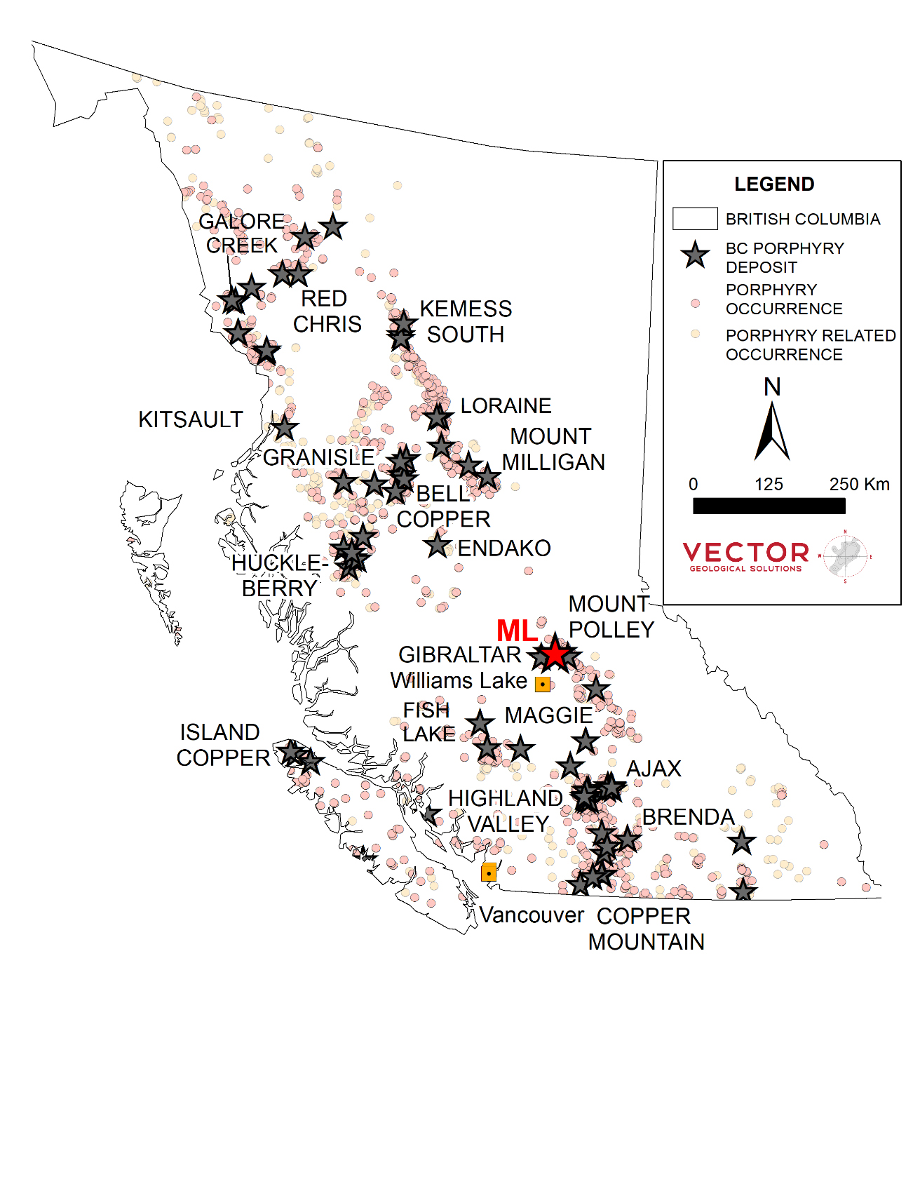 - 8,736 Ha (87 km2) brownfields land position 6 kilometres northwest of Mt. Polley, 28 kilometres east of the Gibraltar Mine and 6 kilometres southwest of Osisko's QR Deposit.