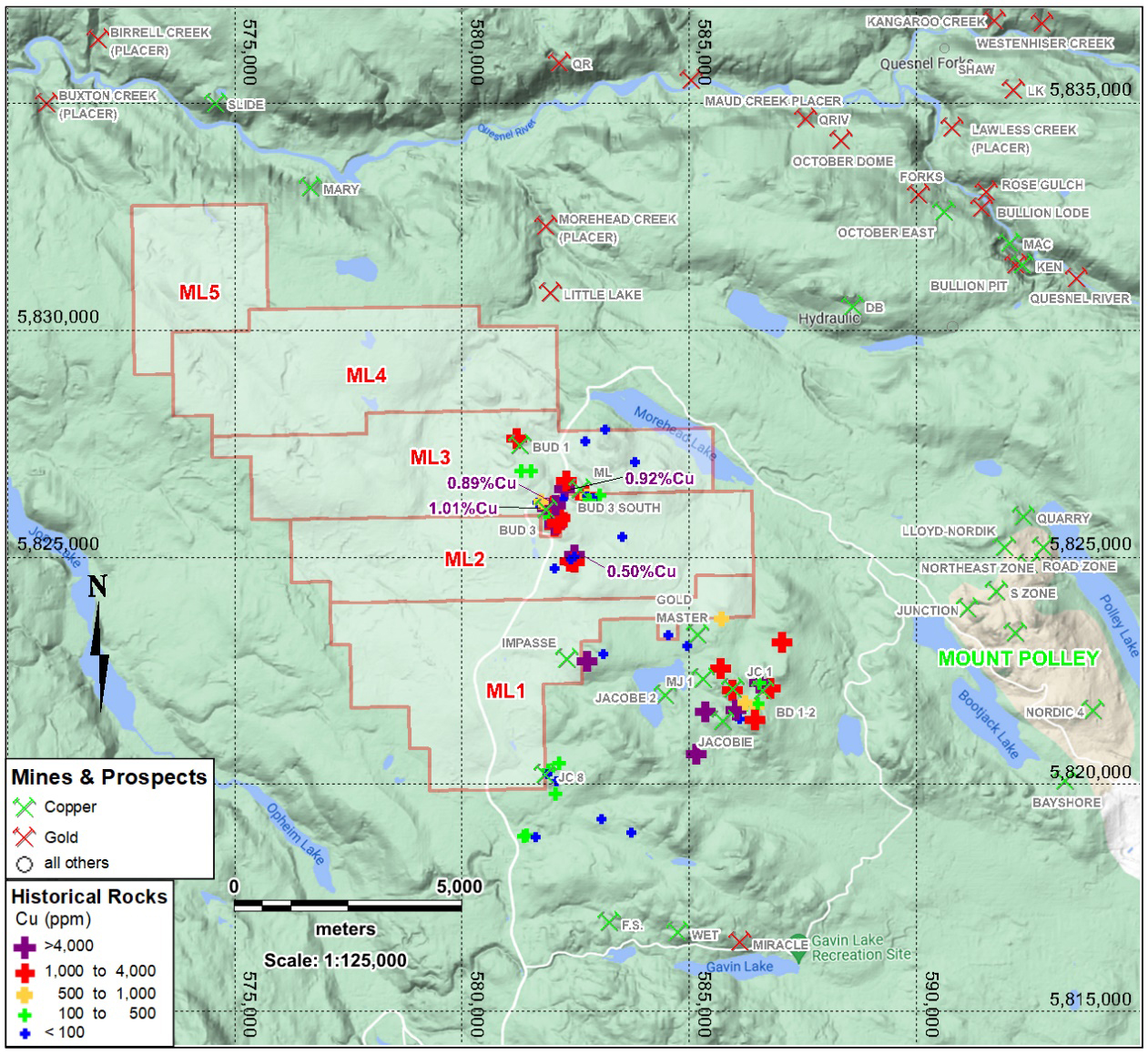 The ML copper-gold property, located in central British Columbia, is accessible year-round along the Likely Road, approximately 87 kilometres northeast of Williams Lake. The property is accessed along numerous logging roads. The 8,736-hectare property contains multiple ARIS copper and gold occurrences and is considered prospective for mesothermal gold and porphyry copper-gold-molybdenum deposits. Historical exploration is concentrated on the higher elevation terrain along the southeast edge of the property where favourable units crop out. Historical grab sampling at ML has yielded up to 1.01% Cu (Assessment Report 215842) and up to 0.65 g/t Au (Assessment Report 129033). A small drill programme in 1985 targeted a copper soil anomaly associated with a mineralized monzonite stock and adjacent volcanic and sedimentary units and comprised short (45 to 92m) holes that total 435m. This drilling did not adequately test the mineralized outcrops located northwest and upslope from the soil anomaly.