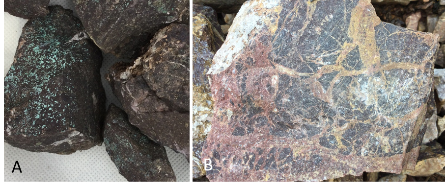Figure 3. A) Copper oxide in fractured chlorite altered basalt; B) Hematite-limonite-silica cemented breccia with silicified basalt clasts.Qualified Person