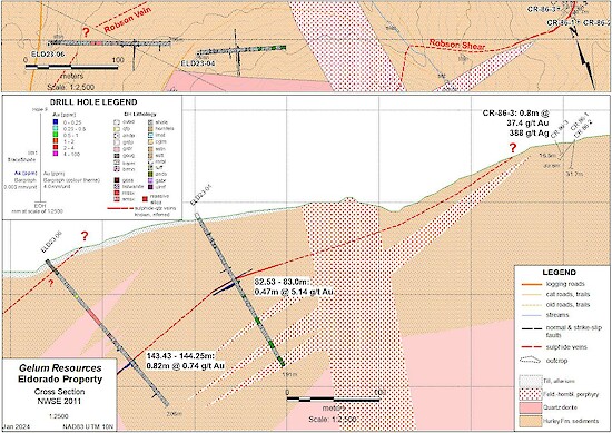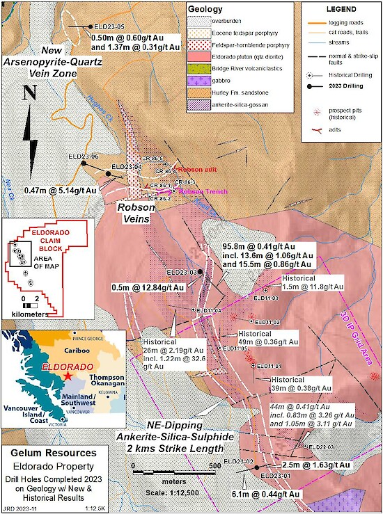 FOR IMMEDIATE RELEASE…Vancouver, BC – January 17, 2024 – Gelum Resources Ltd., (the "Company" or "Gelum", CSE: GMR, OTCQB: GMRCF), through its option agreement with Wealth Minerals Ltd. (“Wealth”, or the “Optionee”, CSE: WML), has received assay results for six diamond-drill holes (1340 metres) completed in October at the Eldorado Gold Project (see news release dated October 16, 2023). Breccia and veins comprising chalcedonic silica (indicative of a high-level epithermal gold environment) with iron-carbonate and sulphides were intersected in all holes. The best intersection assayed 0.412 g/t gold over 95.8 metres (ELD23-03 from 101.65 to 197.5 m), which includes two higher-grade intervals of 5.78 g/t Au over 1.70 meters and 5.66 g/t Au over 0.55 meters. A narrow arsenopyrite vein near the top of the hole (at 6m) contains visible gold and assayed 12.84 g/t Au over 0.5 meters. Both intercepts are open in all directions.