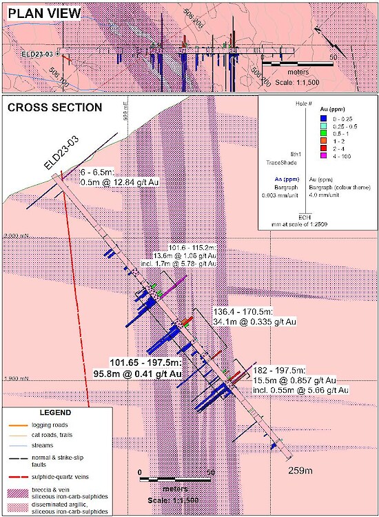 Hole ELD23-05 (239 m), targeted a series of moderately southeast to northeast-dipping arsenopyrite-silver veins in intensely silicified siltstone/sandstone exposed in a newly discovered outcrop below the main logging road, along Hughes Creek. The new showing is one kilometre below the Robson showing and on strike with the regional north-northwest mineralized trend (see Figure 1). At least three arsenopyrite veins from 1 to 10 cm thick are exposed for several metres along strike. Chip samples returned 1.75 g/t Au over 0.40m and 2.25 g/t Au over 0.2m. These veins, and an additional eastern vein, were intersected by ELD23-05 at the projected depths. Three separate intervals ran 0.75 m at 0.294, 0.5 m at 0.605, and 1.37 m at 0.307 g/t Au (true widths estimated at 70-90%). The strong alteration suggests more mineralization could occur beneath the thick till cover to the east, on the main mineralized trend, and geophysics is warranted to develop additional drill targets.