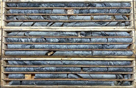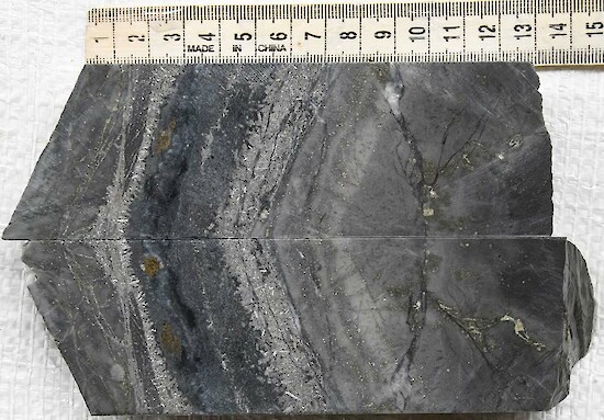 Photo 2: ELD23-04 at 82.7 m: stibnite-galena-sphalerite-arsenopyrite vein with quartz envelope; a 0.47 m sample across this returned 5.14 g/t Au, 89 g/t Ag.