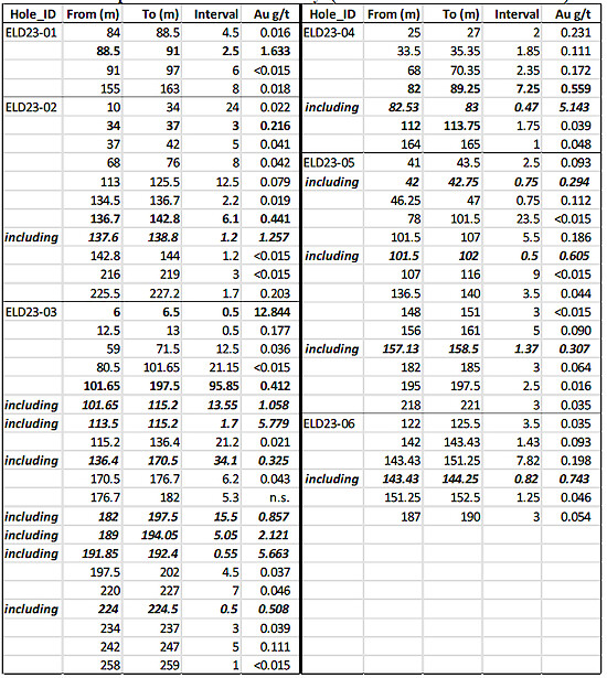 ELD23-04 intersected a polymetallic sulphide-quartz vein (9 cm true width) mineralogically identical to the Robson shear zone, at 82.7 metres down hole (Photo 2). A 0.47-metre sample across the vein and alteration halo returned 5.143 g/t Au and 89 g/t Ag. Hole ELD23-06 was collared northwest and below ELD23-04 and was designed to intersect this sulphide vein approximately 150 m down-dip. At a depth of 143.4 m, a 1 cm arsenopyrite vein was intersected at 75o to core and aligns with the downdip extension of the vein; a 0.82 m sample returned 0.743 g/t Au.