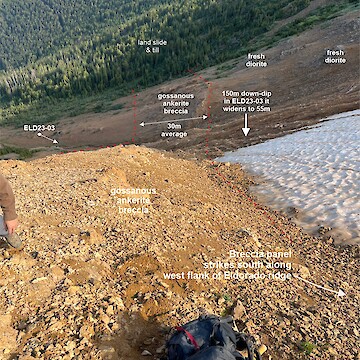 - Drilling has intersected gold mineralization in all holes, associated with intense alteration (silica and iron-carbonate) in sulphide-rich, quartz-cemented breccias and veins.